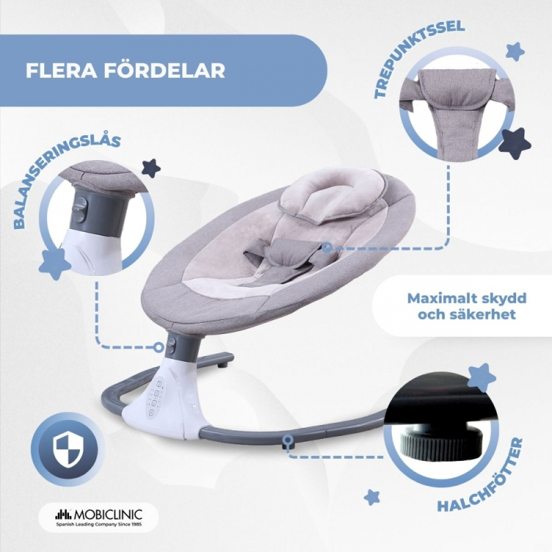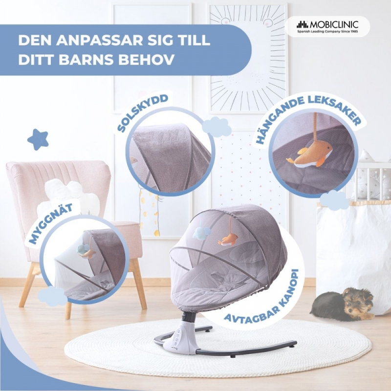Gunghängmatta | Justerbar hastighet | Musik- och leksaksstång | 3-punktssele | Myggnät | Tuktuk | Mobiclinic