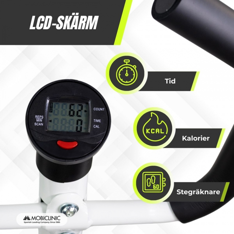 Tack vare sina rörliga armar erbjuder den ett komplett träningspass som förbättrar koordination och uthållighet samtidigt som den hjälper till att förbränna kalorier. Dess ergonomiska design ger flytande rörelser, vilket minimerar belastningen på lederna. Den har en LCD-skärm som automatiskt visar följande värden: träningstid, beräknade kalorier, ackumulerade steg och steg per minut. Den har en automatisk avstängning efter 4 sekunders inaktivitet och en automatisk skanningsfunktion som växlar informationen var fjärde sekund.