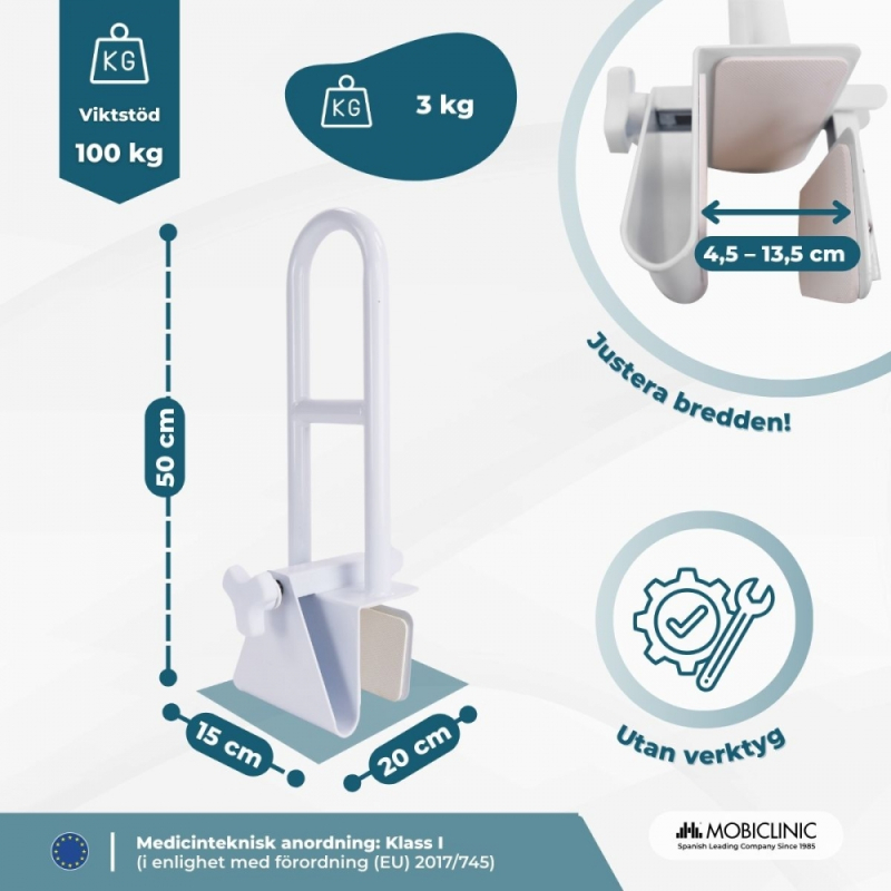 Den passar badkar med släta, plana kanter, med en minsta bredd på 4,5 cm och högst 13,5 cm, och anpassar sig till olika badkarsmodeller. Dess ergonomiska handtag ger ett fast och säkert grepp, även med våta händer. Den utmärker sig främst för sin robusta design, som klarar upp till 100 kg, och är perfekt för både klinisk och hemmabruk.
