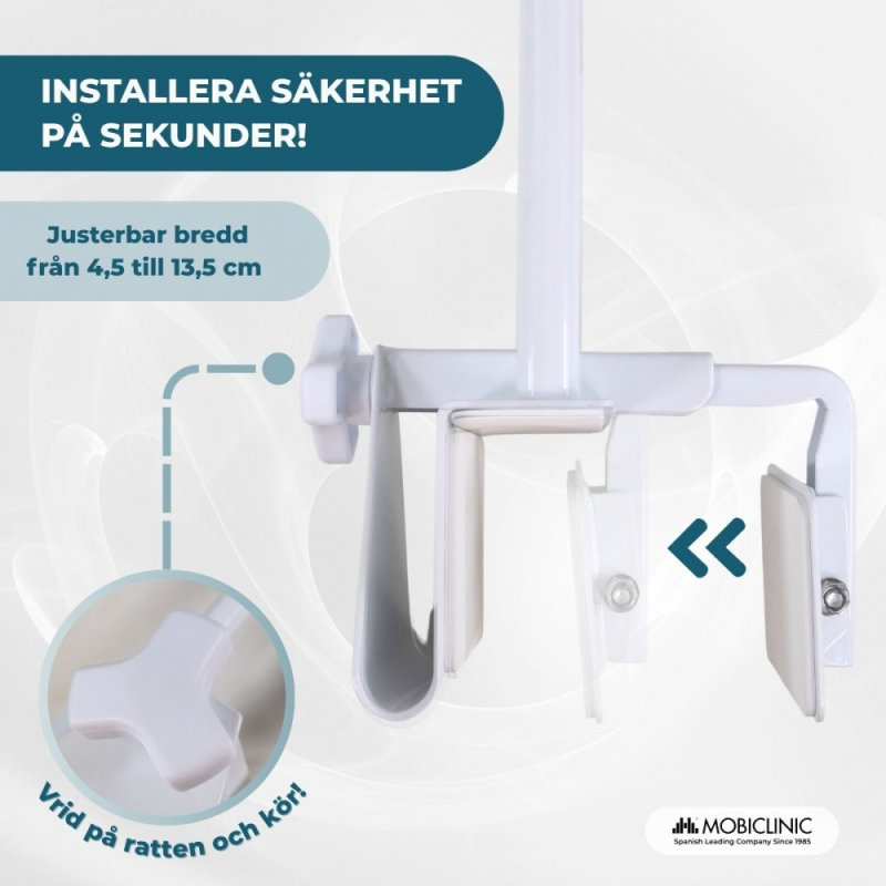 JUSTERBAR OCH MÅNGSIDIGA: Detta stödhandtag passar badkar med plana, släta kanter, med en minsta bredd på 4,5 cm och högst 13,5 cm. Tack vare sitt fästsystem och justerbara delar kan det enkelt installeras var som helst, både på kliniker och i bostäder.