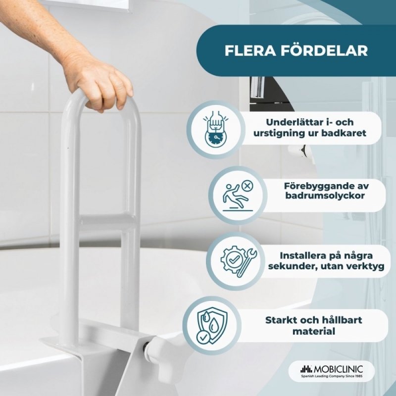 Mobibary badkarshandtag är den perfekta lösningen för seniorer, personer med nedsatt rörlighet eller de som genomgår rehabilitering och behöver ett säkert grepp under badstunden. Dess ergonomiska design ger ett fast grepp, vilket minskar risken för fall eller halk i badrummet.