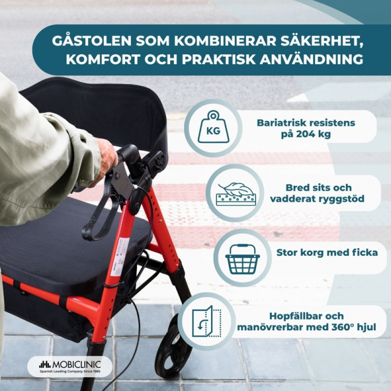 Gåstolen Madeira Mobiclinic för överviktiga personer är utformad för att ge maximal stabilitet, styrka och komfort . Med en lastkapacitet på upp till 204 kg överträffar den standardmodellerna (100–120 kg) vida, vilket gör den idealisk för överviktiga användare eller de som söker större säkerhet när de rör sig.