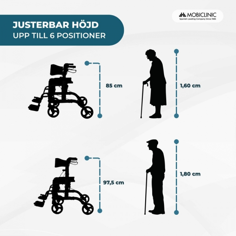 Ibiza Mobiclinic rollator med fotstöd är ett hjälpmedel utformat för att erbjuda säkerhet, komfort och praktisk användning i vardagen. Tack vare sitt justeringssystem med 6 lägen (84,6–97,3 cm) anpassar den sig till olika användare, vilket främjar korrekt hållning och minskar trötthet vid gång.