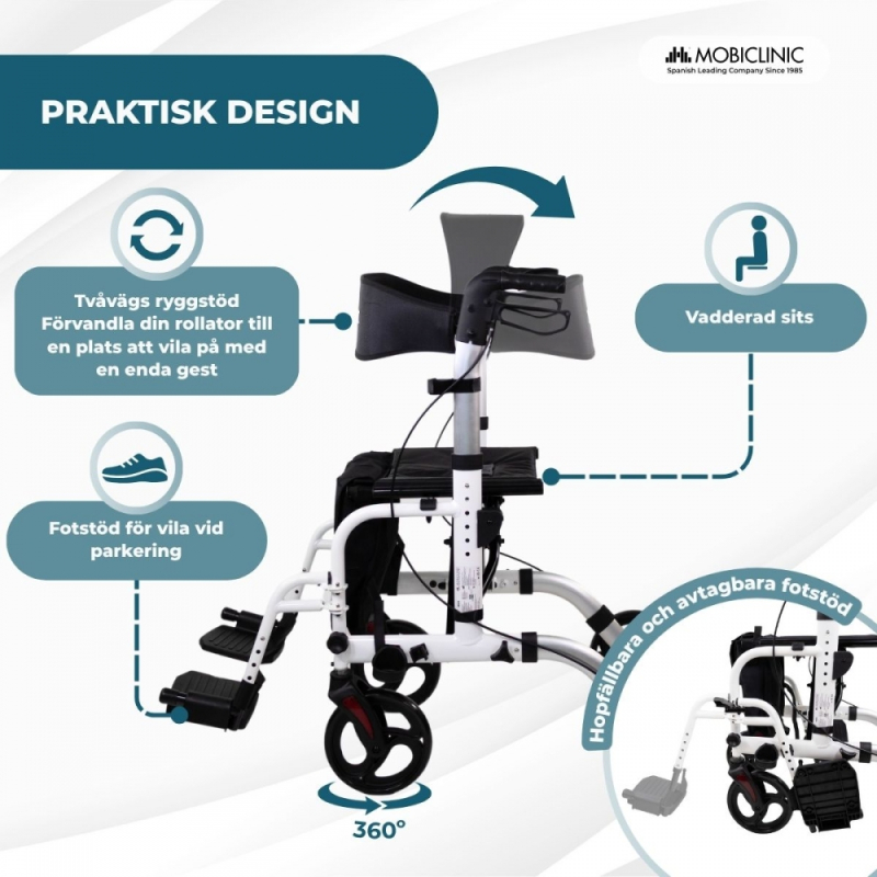 Den har en vadderad sits och ett vändbart ryggstöd som kan placeras framåt- eller bakåtvänd, vilket ger bekvämt stöd under pauser. Dess justerbara fotstöd i 5 lägen möjliggör säker och praktisk benstöd, alltid som ett komplement till avkoppling och inte som en ersättning för användning av rullstol.