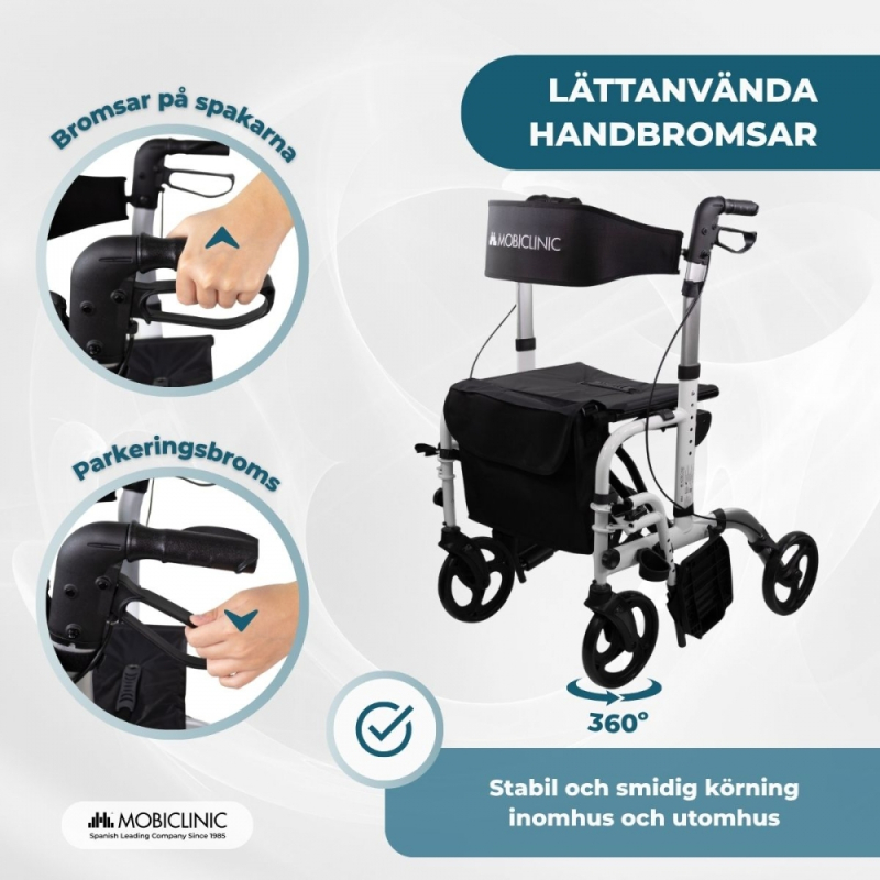 Säkerhet garanteras tack vare den lätta men robusta aluminiumramen , som klarar upp till 136 kg. Dessutom är handbromsarna som är integrerade i handtagen enkla att använda, även för personer med begränsad handstyrka, vilket ger trygghet vid varje användning.