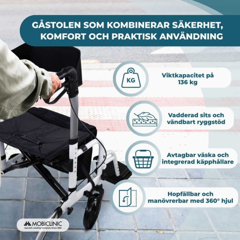 Som en extra bonus ingår en avtagbar shoppingväska tillverkad av slitstarkt Oxford-tyg, perfekt för att bära tillhörigheter, och en integrerad käpphållare som gör vardagen ännu enklare.