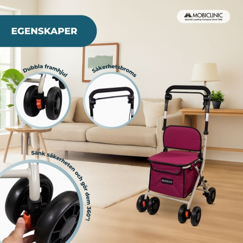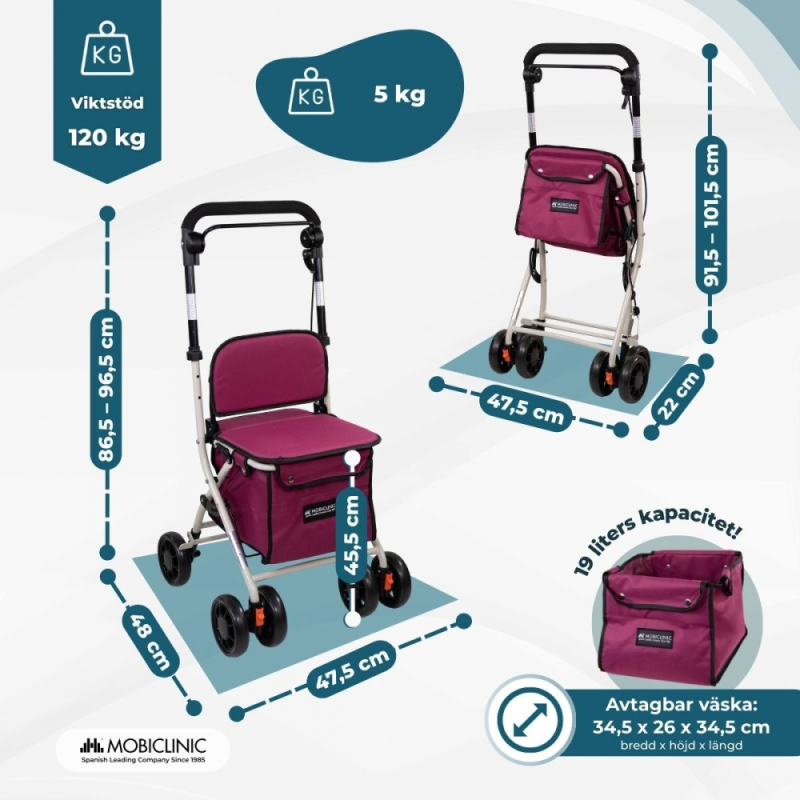 Kundvagnsgåvagn | 4 hjul | Upp till 120 kg | Hopfällbar | Med väska | Bromssystem | Fuchsia| Coliseum | Mobiclinic