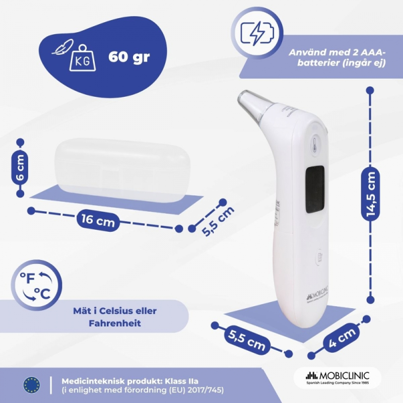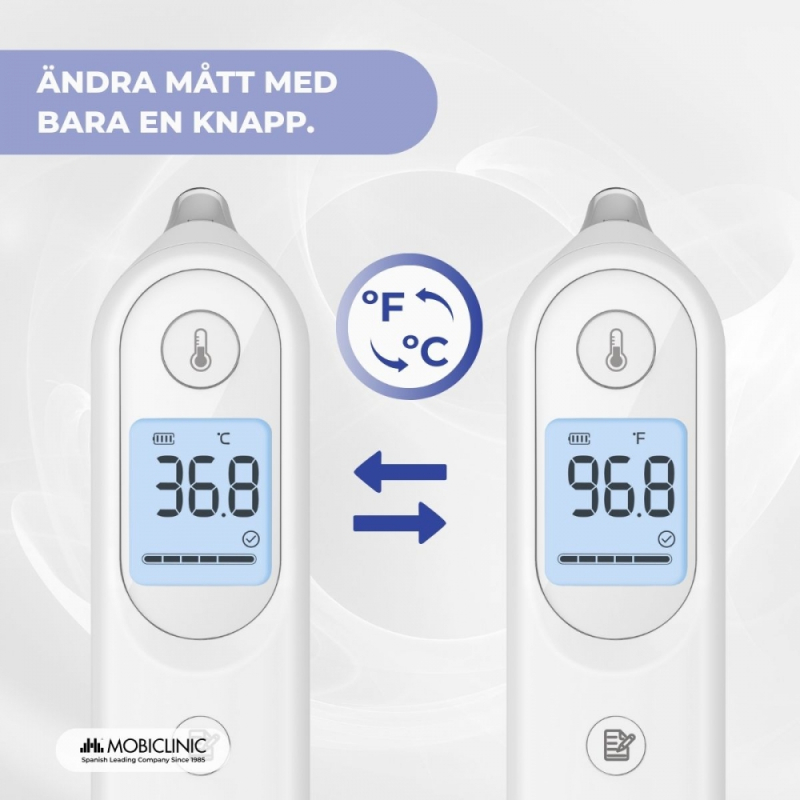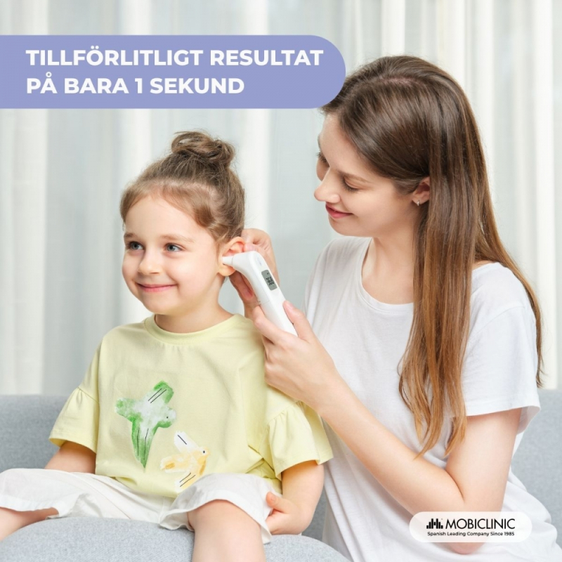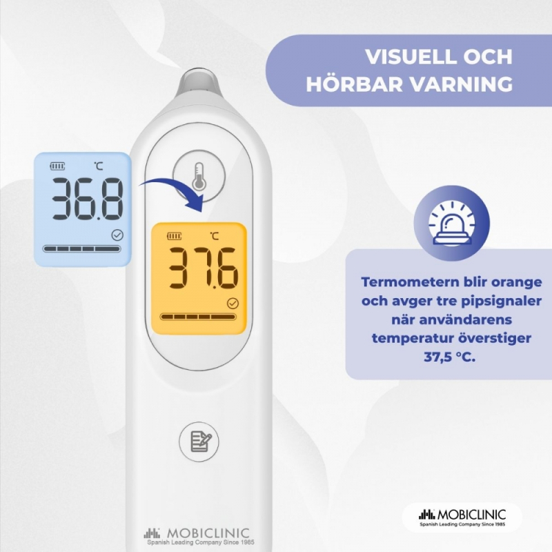 Örontermometer | Minne | Feberlarm | Automatisk avstängning | Display | ºC och ºF | Thermobi | Mobiclinic