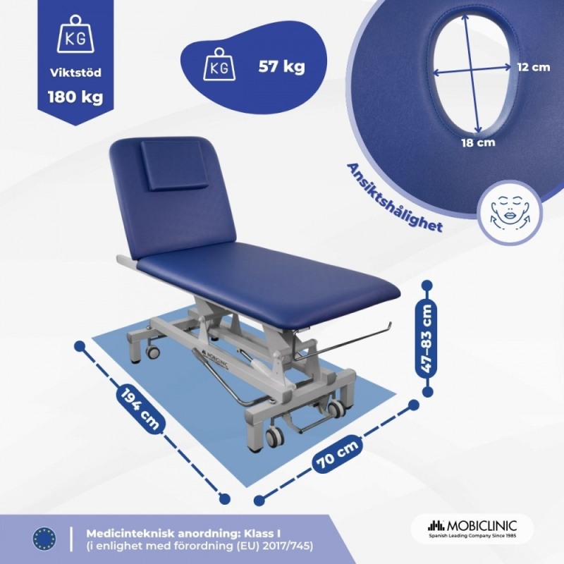 FUNKTIONELL DESIGN: Den hydrauliska båren har en anatomisk ansiktsöppning på 11 x 18 x 8,5 cm med en inbyggd kuddeplugg, vilket ger ökad komfort. Dess stålkonstruktion ger stor motståndskraft mot intensiv användning och frekvent rengöring. Den har en integrerad toalettpappershållare och en maximal vikt på upp till 180 kg.