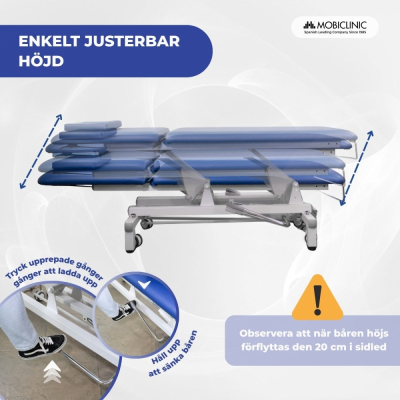 Hydraulisk bår | Justerbar höjd | Lutningsbart ryggstöd | Hål för ansiktsskydd | Infällbara hjul med nivåreglering | Mobiclinic