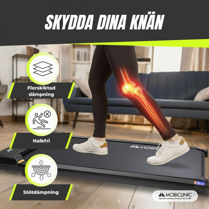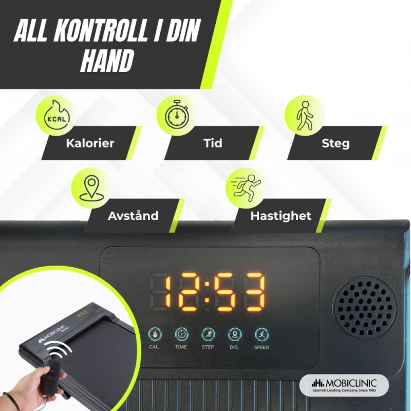 Den erbjuder en justerbar hastighet på upp till 8 km/h och anpassar sig till både måttliga och raska gångtempo, perfekt för alla användare. Den har en fjärrkontroll som låter dig justera hastigheten eller pausa maskinen med bara ett klick, vilket garanterar större komfort och säkerhet.