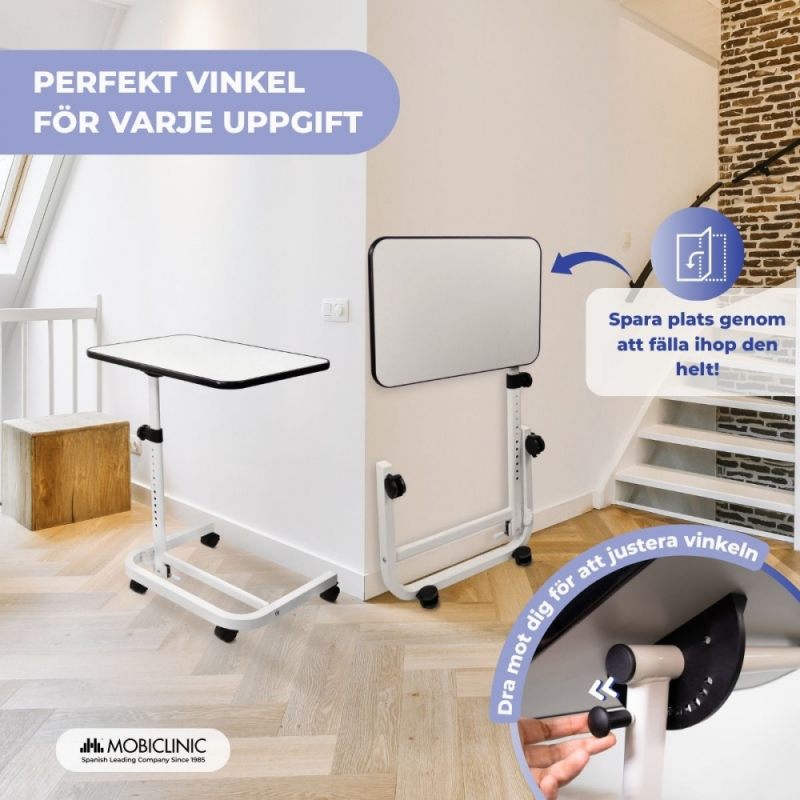 Bordet är hopfällbart och kompakt , så det kan enkelt förvaras var som helst i hemmet och tar nästan ingen plats. Dess C-formade bas gör det enkelt att placera under soffor eller sängar, vilket för det närmare användaren och säkerställer större komfort och bekvämlighet.