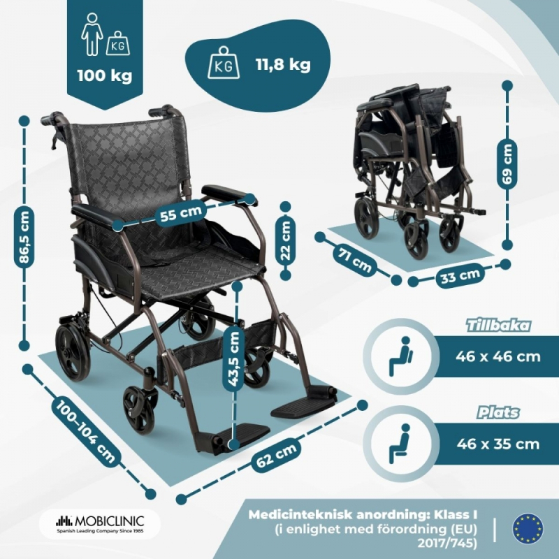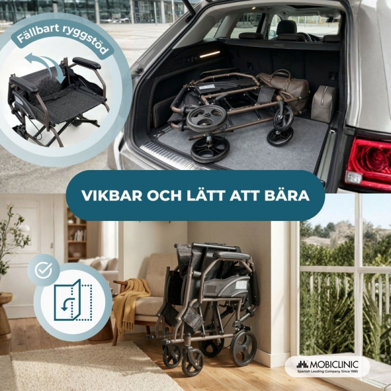 Hopfällbar rullstol | Hopfällbart ryggstöd och fotstöd | Lättvikt | Upp till 100 kg | Dubbla bromsar | Kefren | Mobiclinic