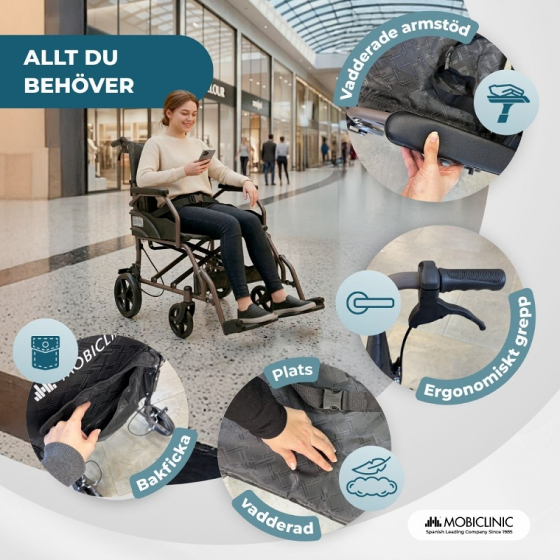Dess fotstöd är rymliga och utformade för att främja en bekväm benställning, och armstöden är vadderade för extra komfort under användning. För rörlighet har den stora bakhjul som ger stabilitet under förflyttning och svängbara framhjul som underlättar manövrering och möjliggör smidiga och precisa svängar.