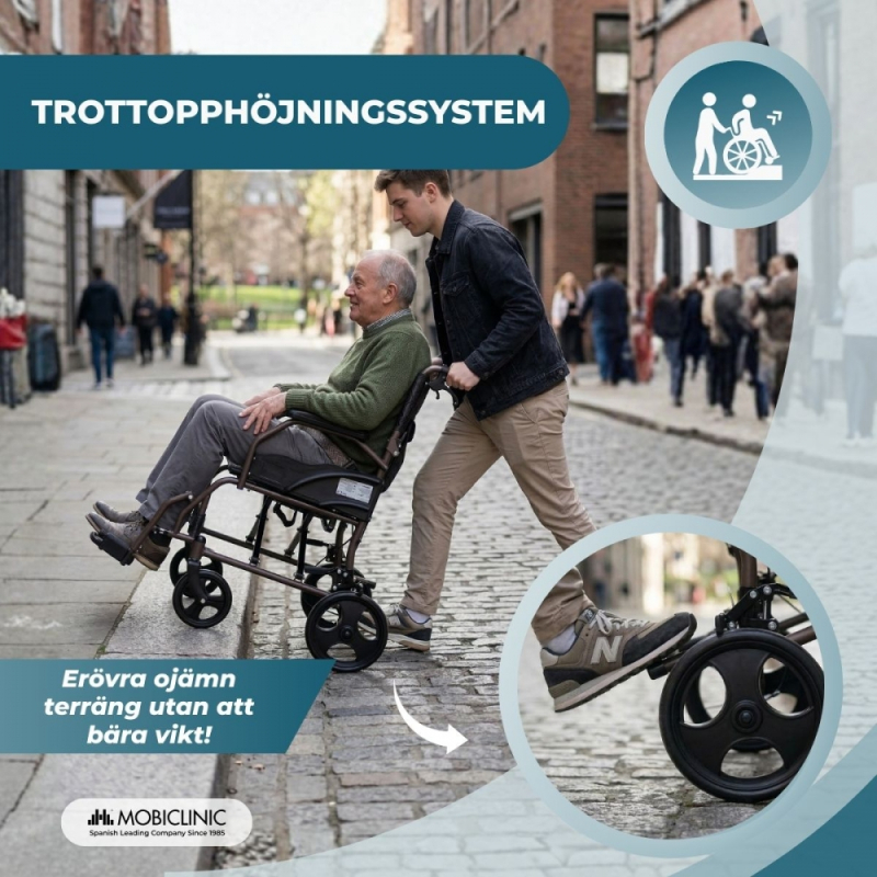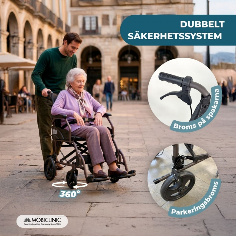 MANÖVERBAR OCH STABIL: Den har stora bakhjul som erbjuder stabilitet och säkerhet under körning, tillsammans med svängbara framhjul som garanterar större manövrerbarhet och smidiga riktningsförändringar, vilket gör den lättare för användaren och följeslagaren att hantera.